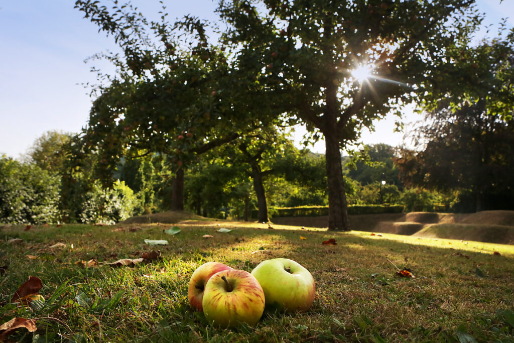 Bekannte Apfelsorten wie „Jakob Fischer“ aber auch sehr alte Apfelsorten, wie die „Goldrenette von Blenheim“, die man um 1740 in Woodstock, Oxfordshire nahe dem Schloss von Blenheim fand.