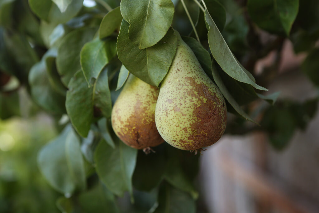 Auch kunstvoll geschnittene Birnenspaliere entlang der Remise unterstreichen die lange Obstkultur im Staatsbad. Die saftige und süße Sorte „Conference“ zählt zu der beliebtesten Birnensorte Europas.