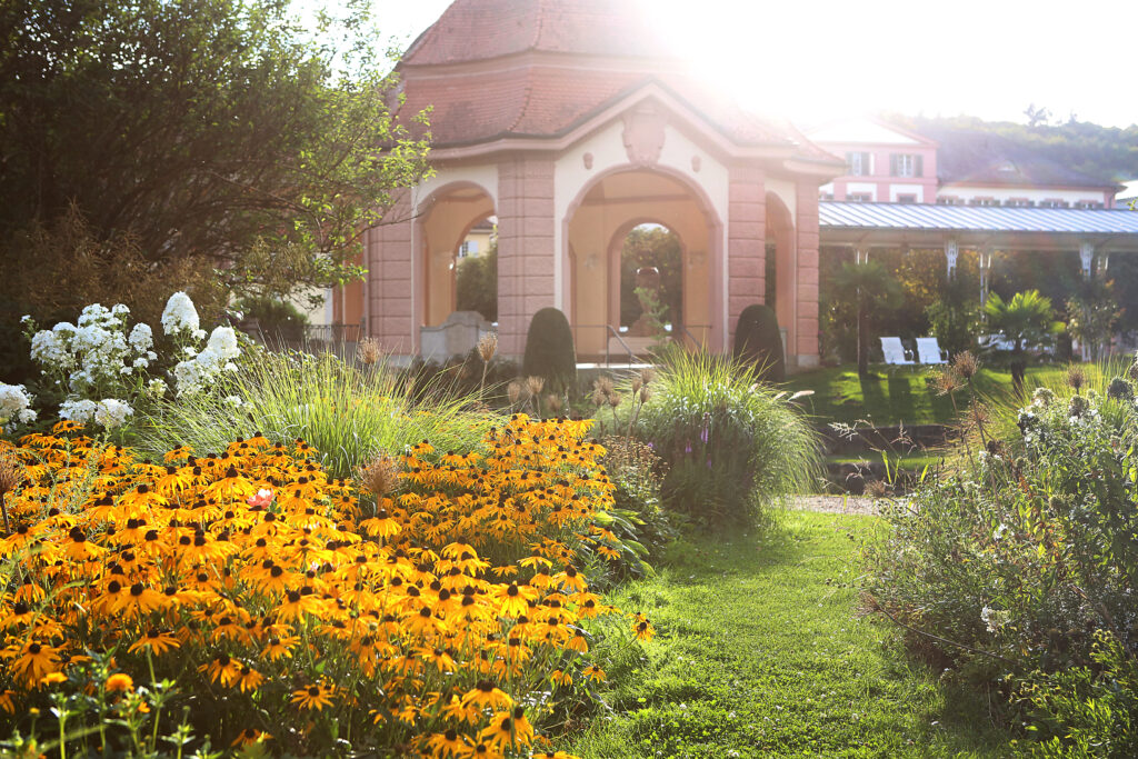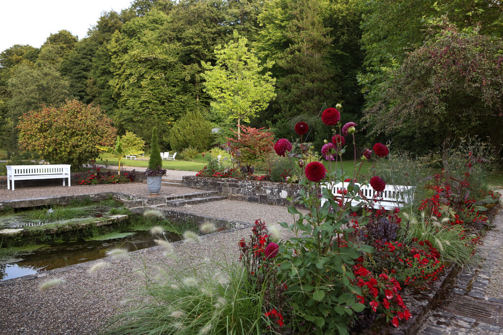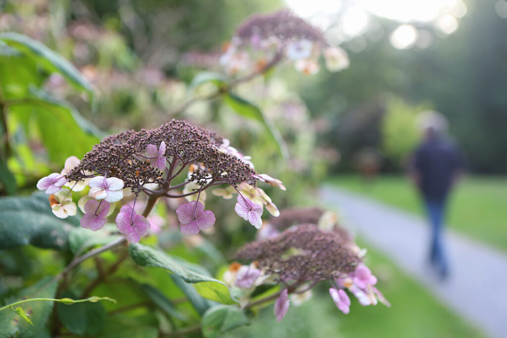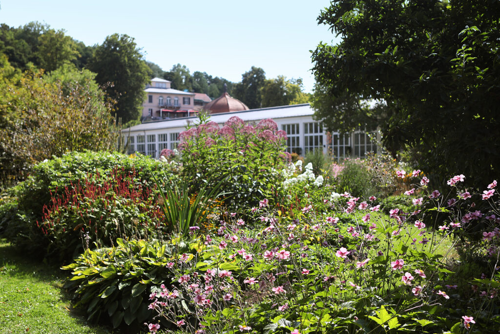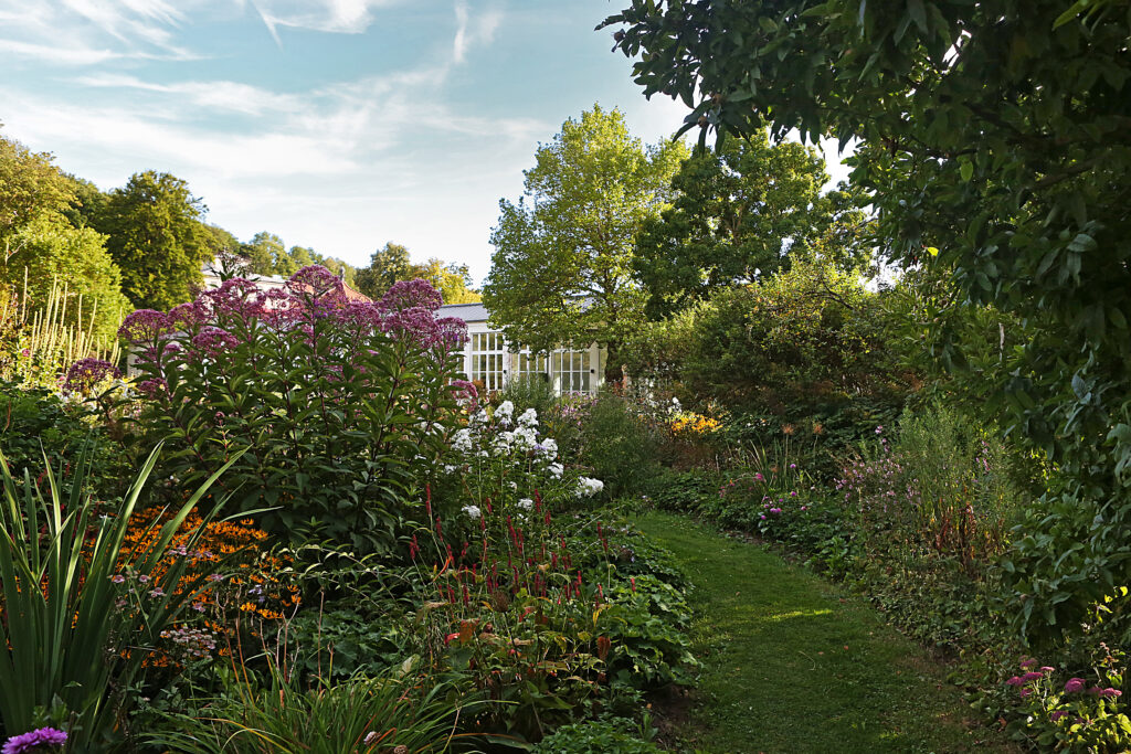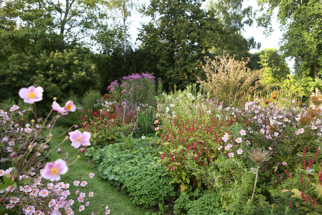 Die 2014 angelegten Staudenbeete im Wandelgarten zeichnen sich durch ihre inselhafte Aufteilung und die geschwungenen Rasenwege aus. In den Staudenbeeten dominieren im Frühling Narzissen und blaublühende Prärielilien. Im Verlauf des Frühsommers (ab Juni) beginnt die Blühphase der Großen Sterndolde (Astrantia major) zusammen mit Frauenmantel (Alchemilla mollis), Iris und Kugellauch. Im Anschluss folgen Staudenphlox (Phlox paniculata) und die Prachtscharte mit ihren ährenförmigen violettrosa Blüten, die auch Schmetterlinge und Hummeln anlockt. Ein weiterer Höhepunkt ist die Blütezeit vom großen Schuppenkopf (Cephalaria gigantea). Die skabiosenähnliche und schwefelgelbe Blüte ist eine Nektarquelle von Juli bis August und lockt unzählige Insekten wie Bienen an. In den Staudenbeeten befinden sich aber auch besondere Gehölze, wie der Goldregen (Laburnum watereri), Echte Mispel (Mespilus germanica) und die selten anzutreffende Kastanien-Rose (Rosa roxburghii). Selbstverständlich tragen auch diese Gehölze dazu bei, dass es im Staudengarten ständig summt und brummt. Im Spätsommer sind es die vielen großen Blüten der Herbst-Anemone (Anemone hupehensis) sowie die Blütenschirme vom bienenfreundlichen Purpurdost (Eupatorium fistilosum). Die weinrote Blütenfarbe vom Purpurdost verträgt sich hervorragend mit den ersten blauviolett blühenden Astern.